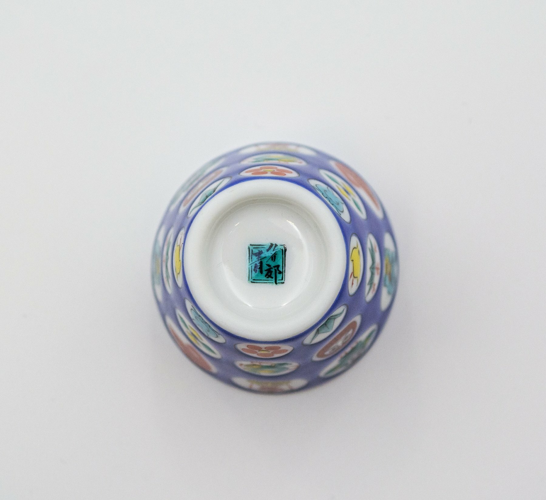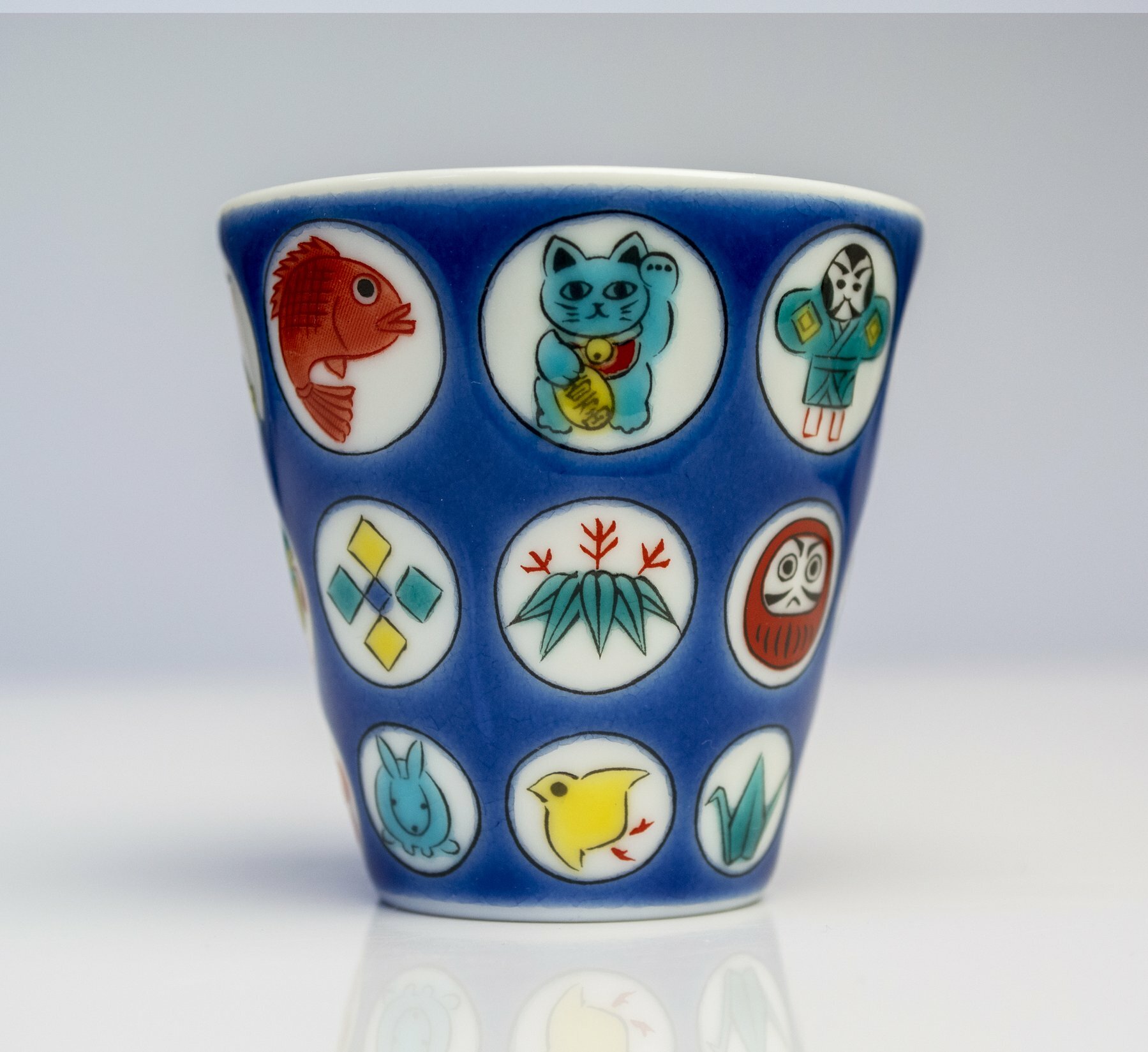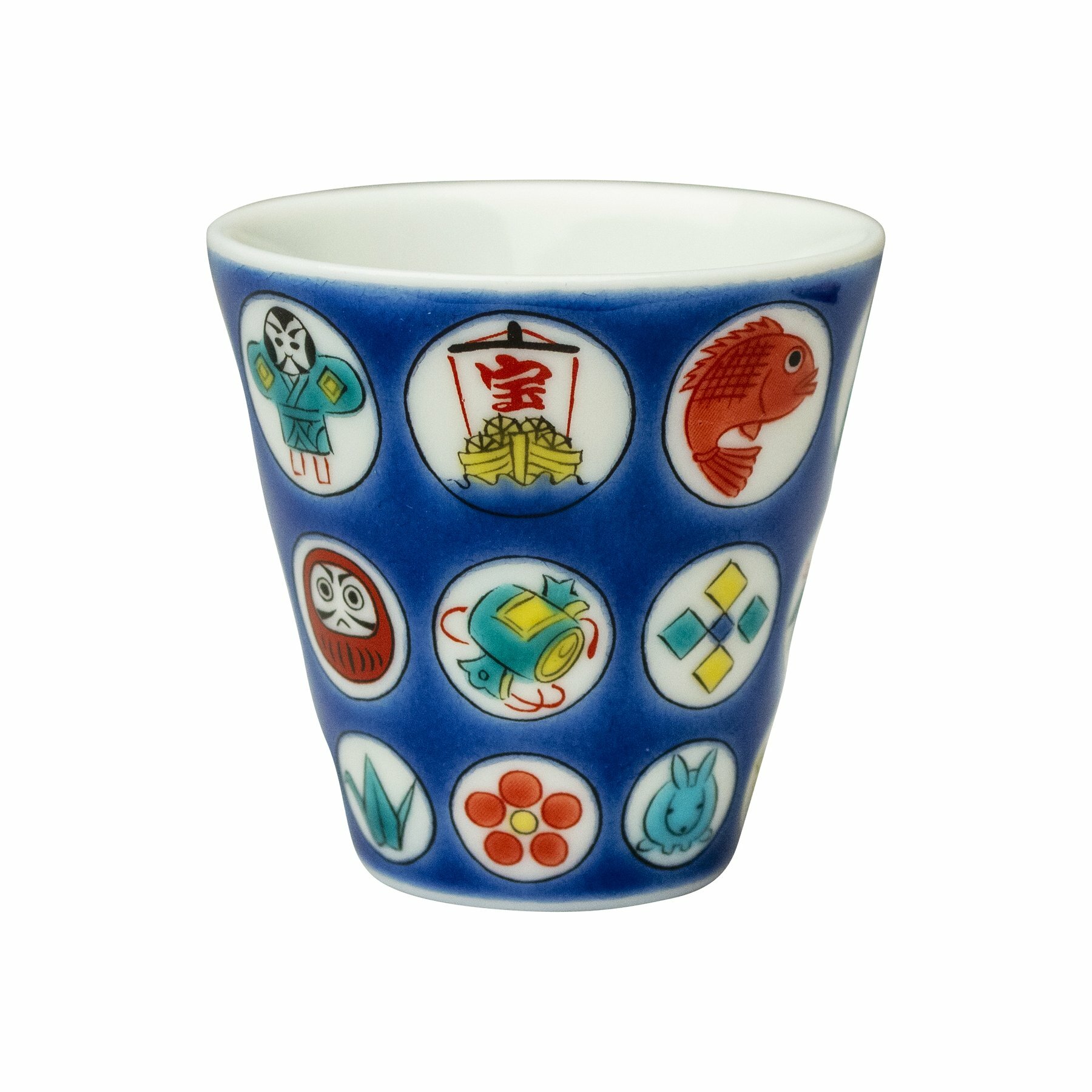 商品説明:招き猫、凪、桜、宝船といったさまざまな吉祥文様が丸紋の中に描かれています。色使いが九谷焼らしいたいへんおめでたい絵柄です。