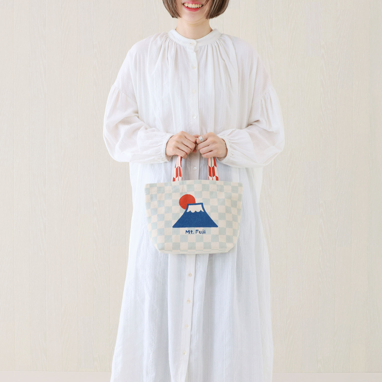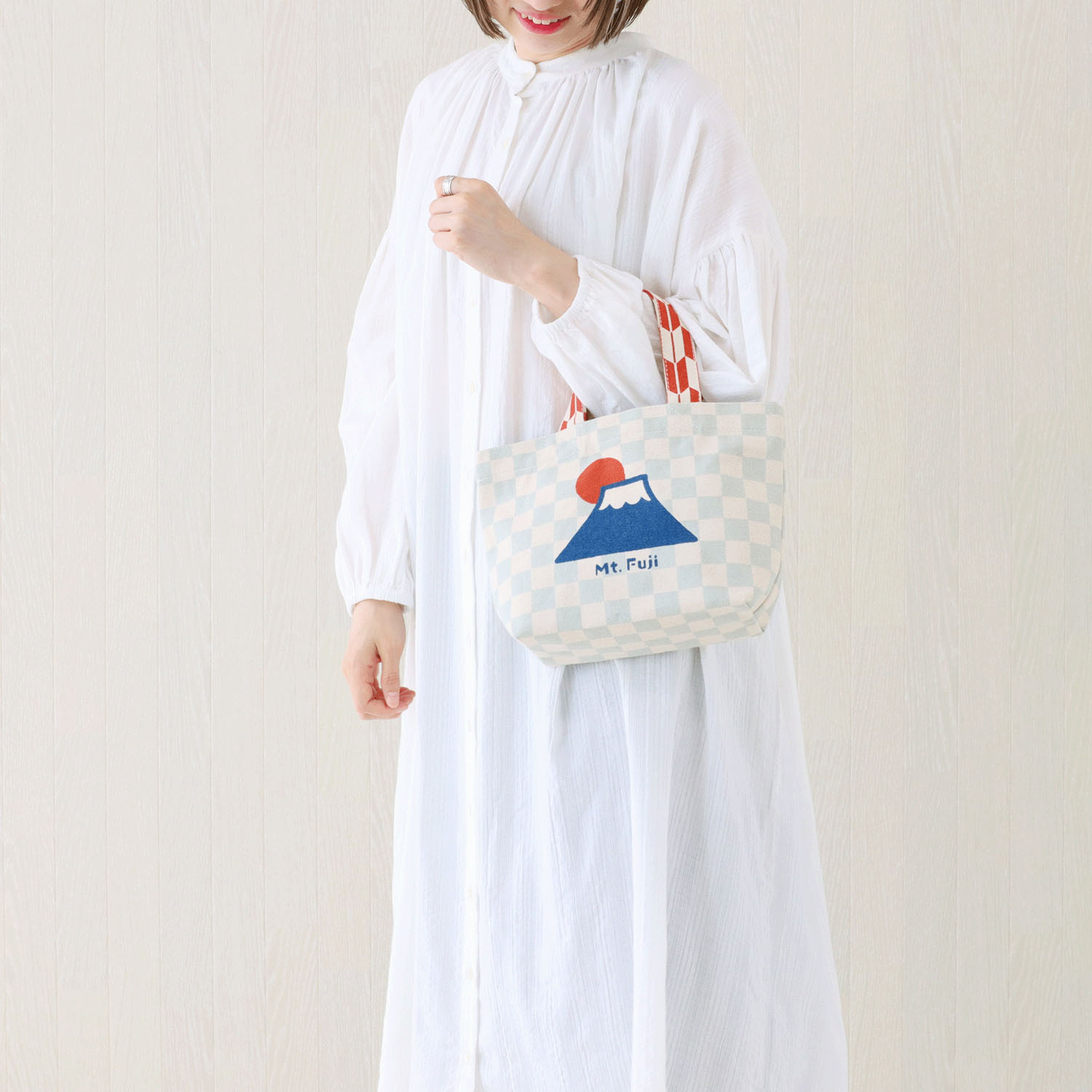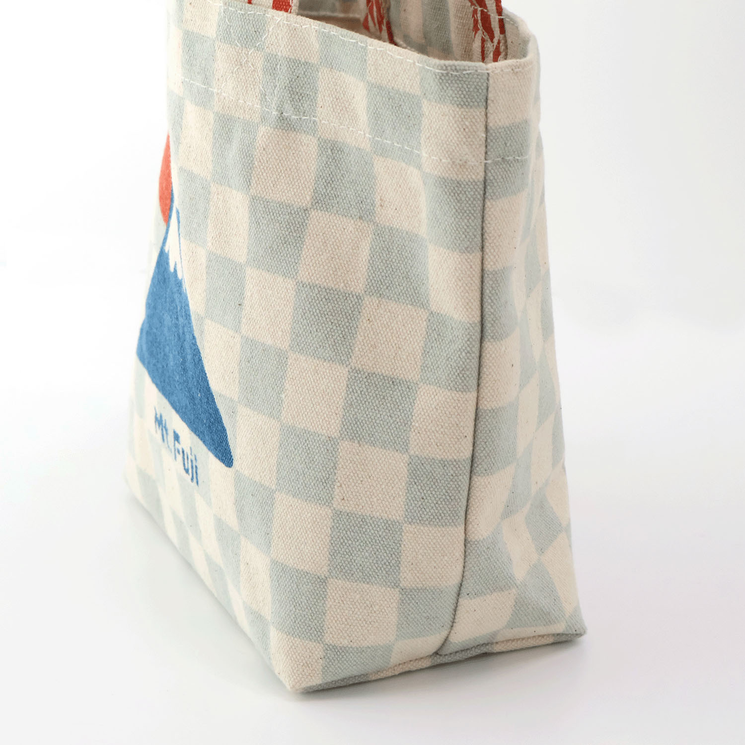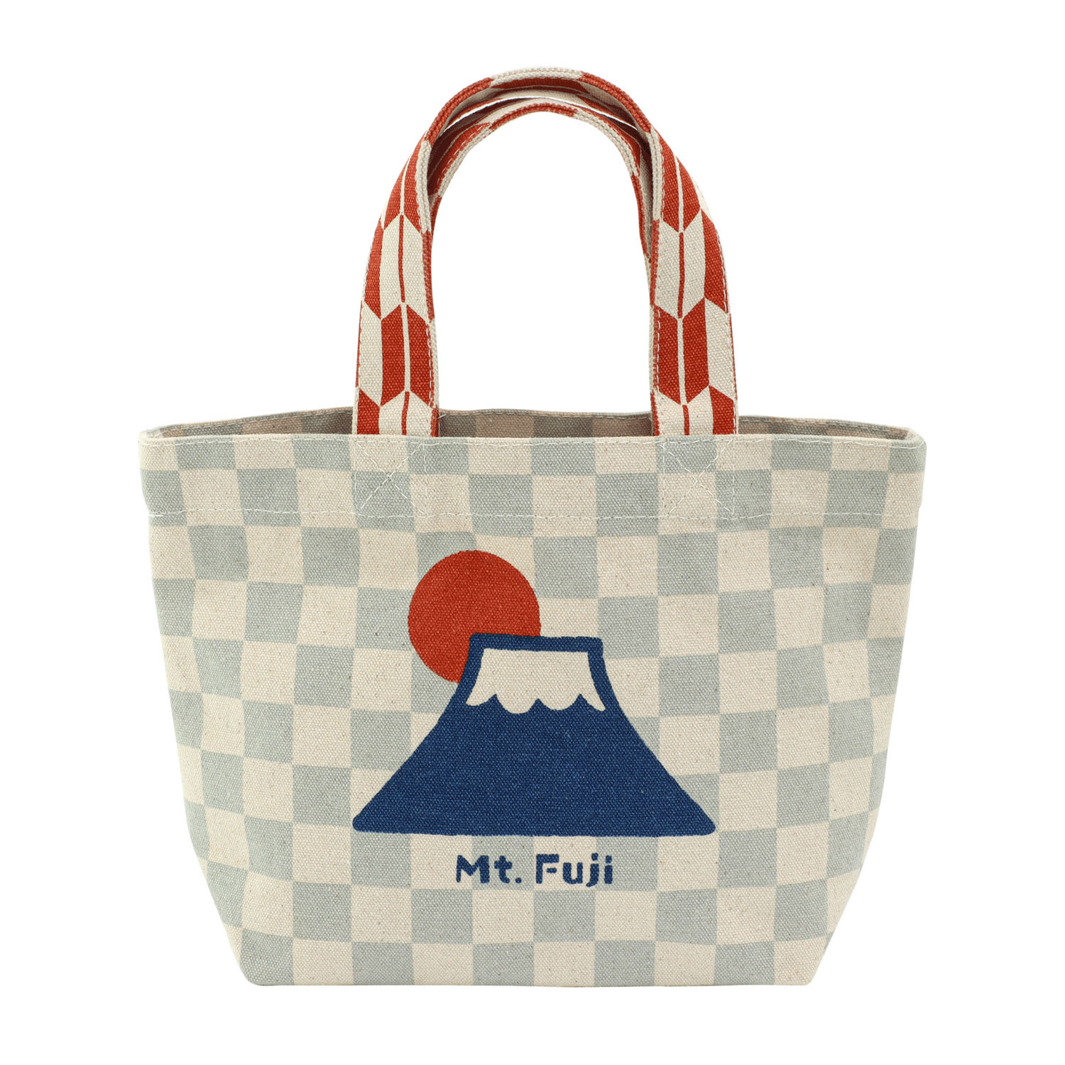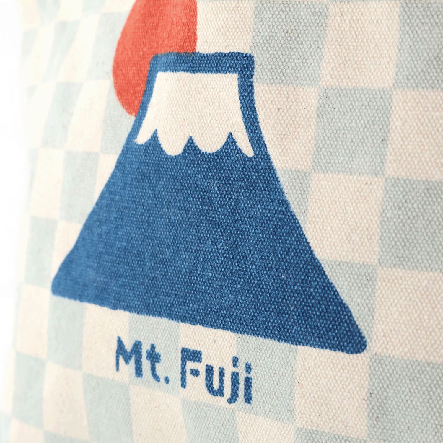 這款帆布包飾有淺色格紋富士山圖案。