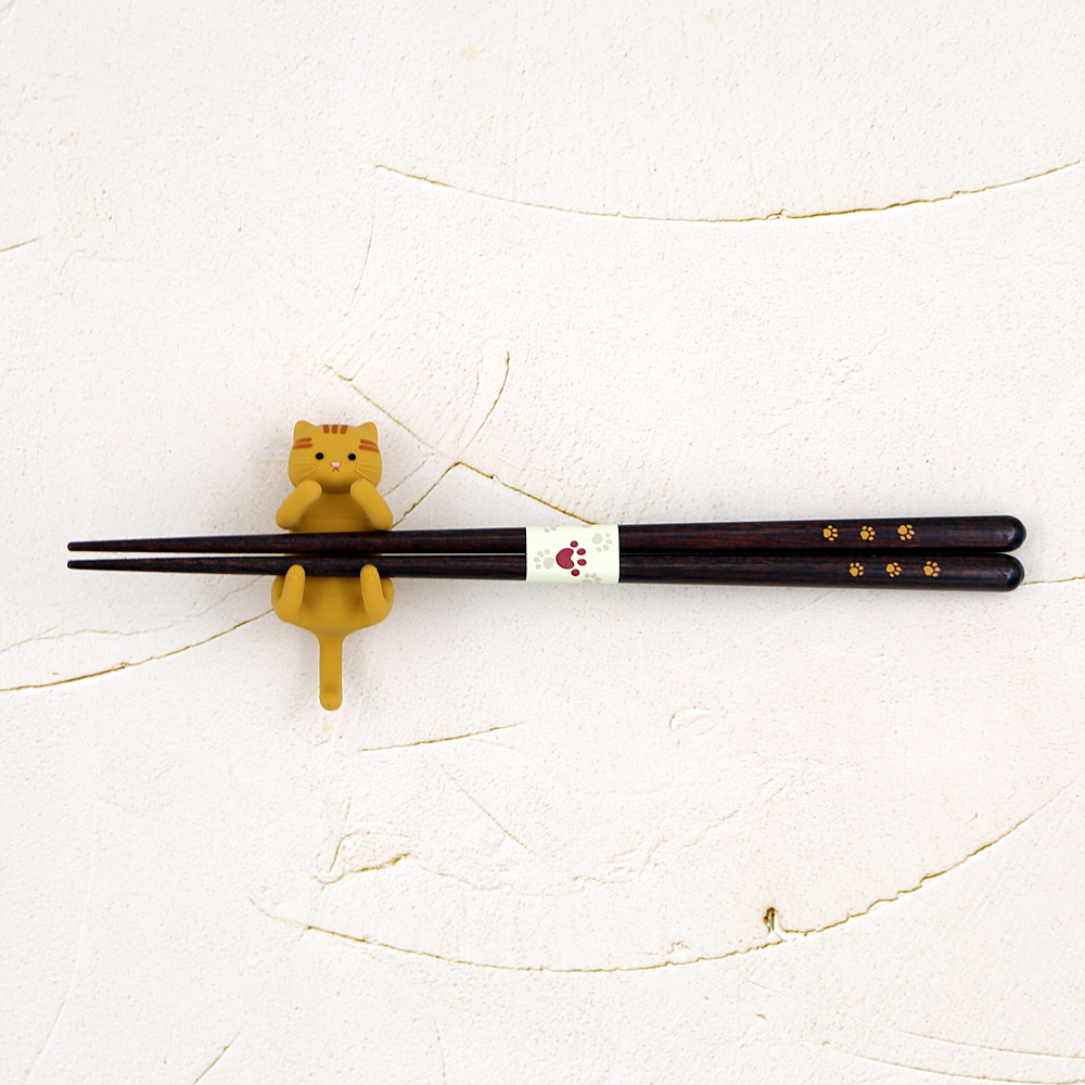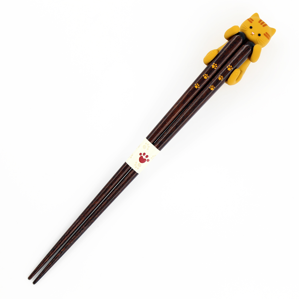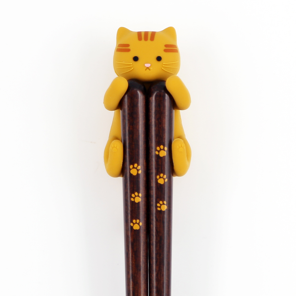 筷子上有一隻可愛的貓。貓貓在使用時可以作為筷子架,收納時可以作為支架放在筷子上。