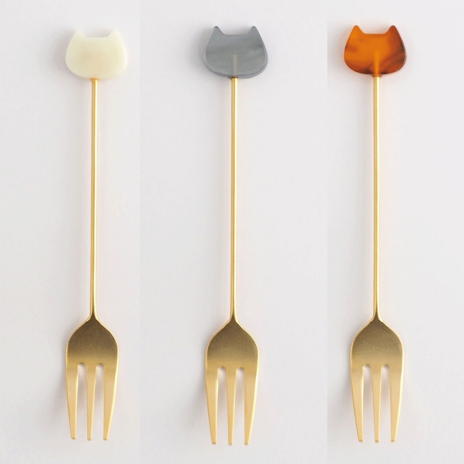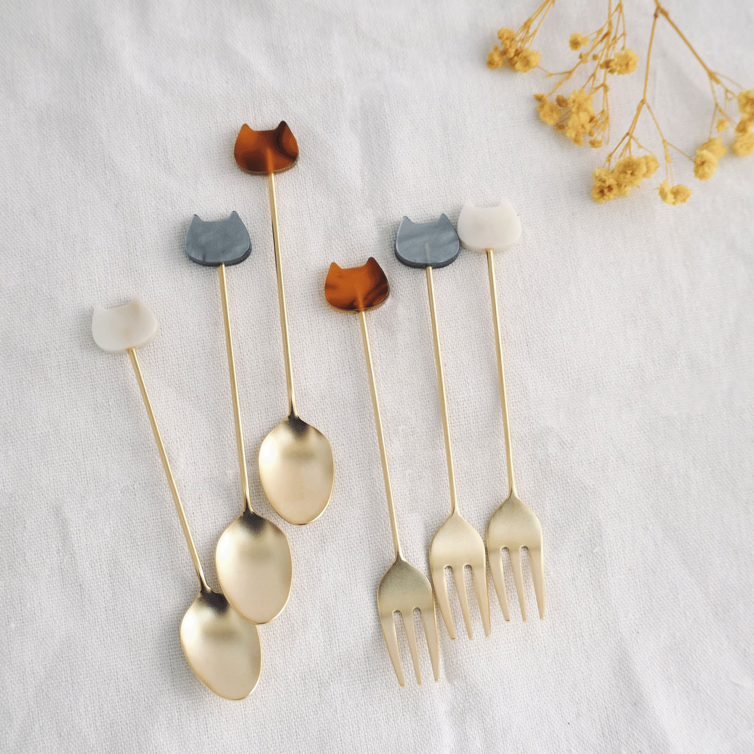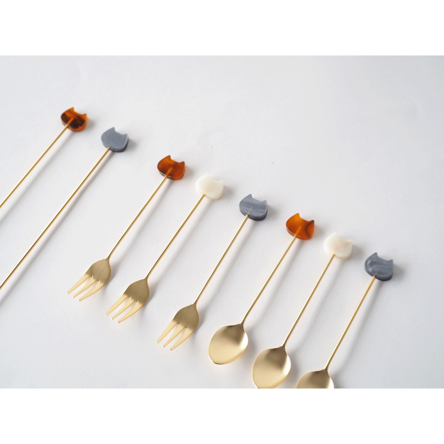 這款餐具飾有大理石紋貓咪裝飾。