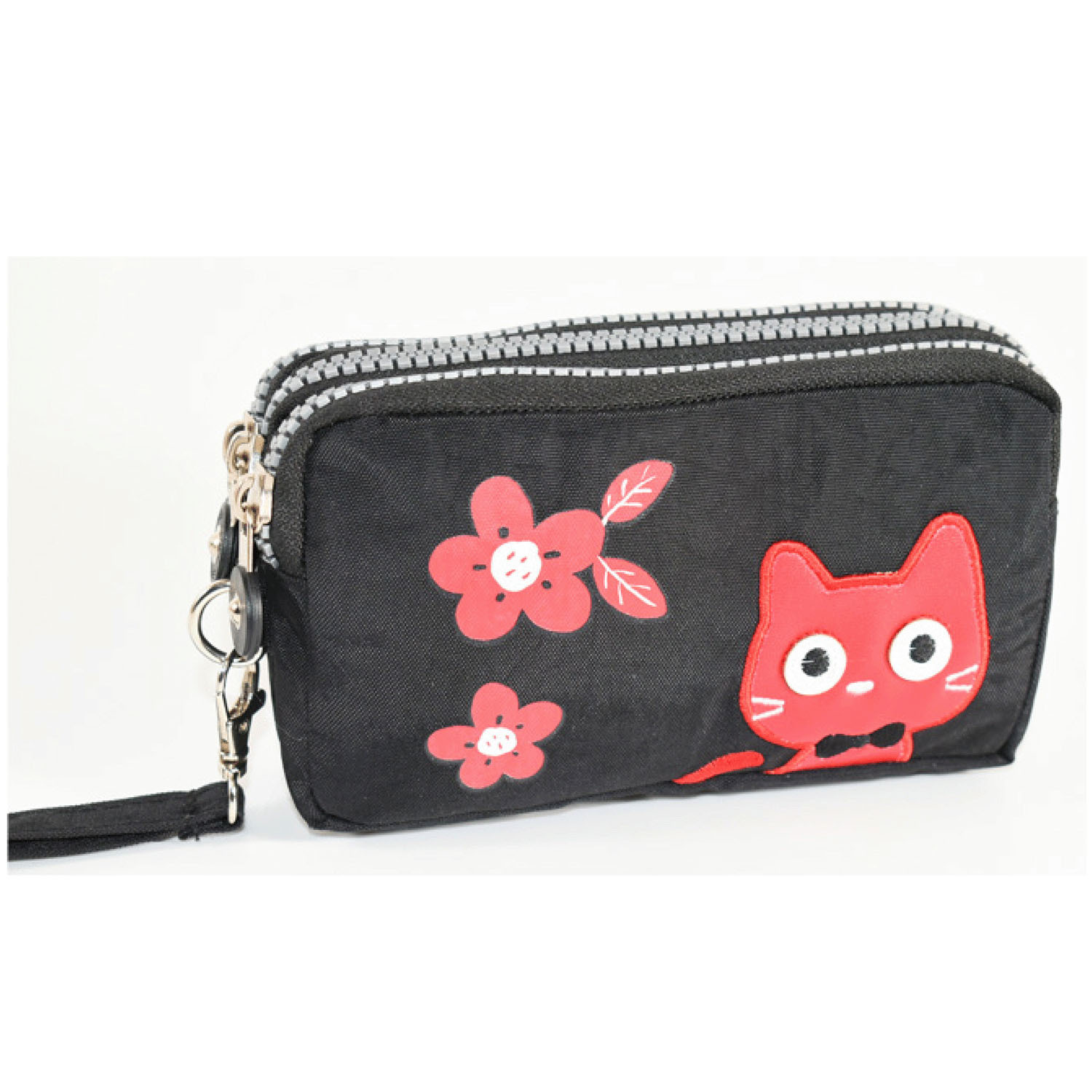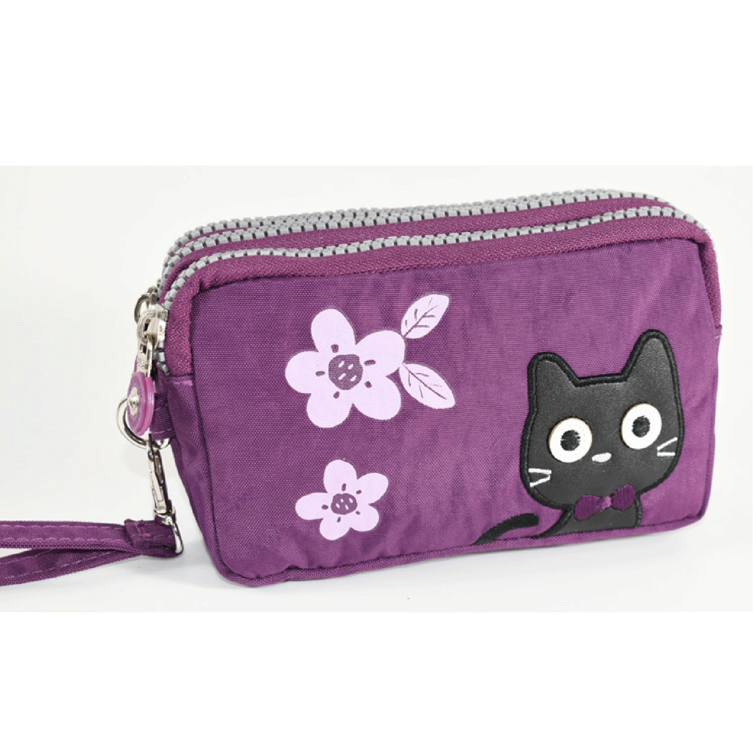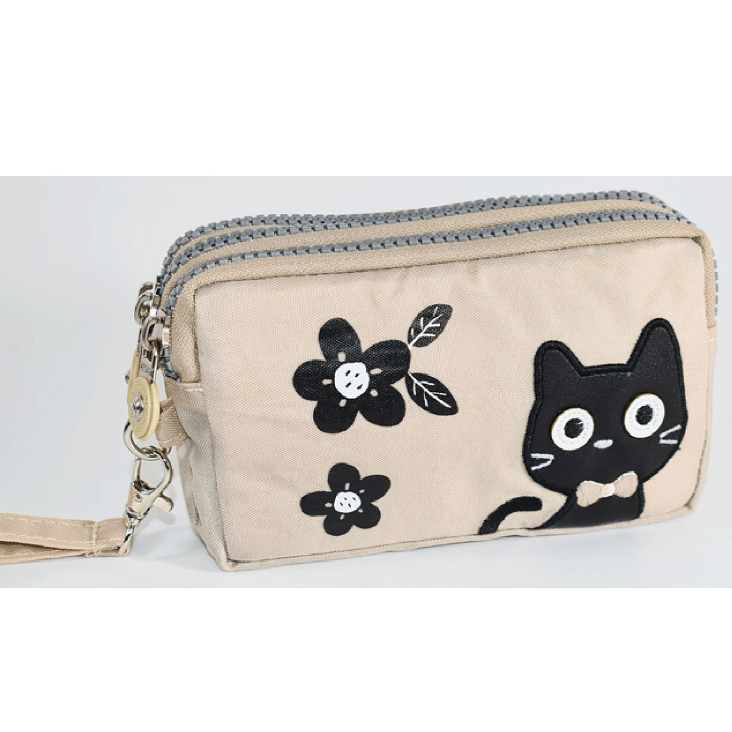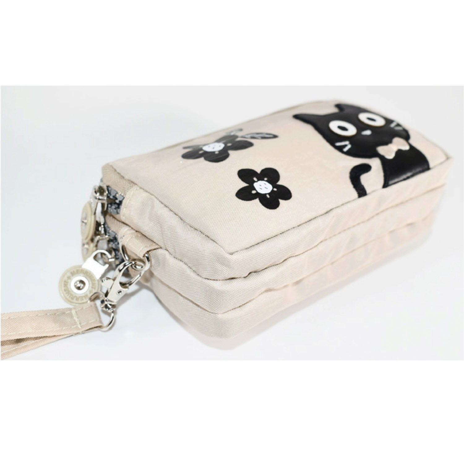 這款小包採用可愛的貓咪圖案,配有三個拉鍊。