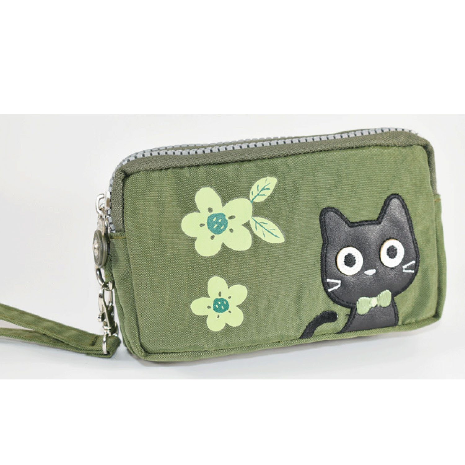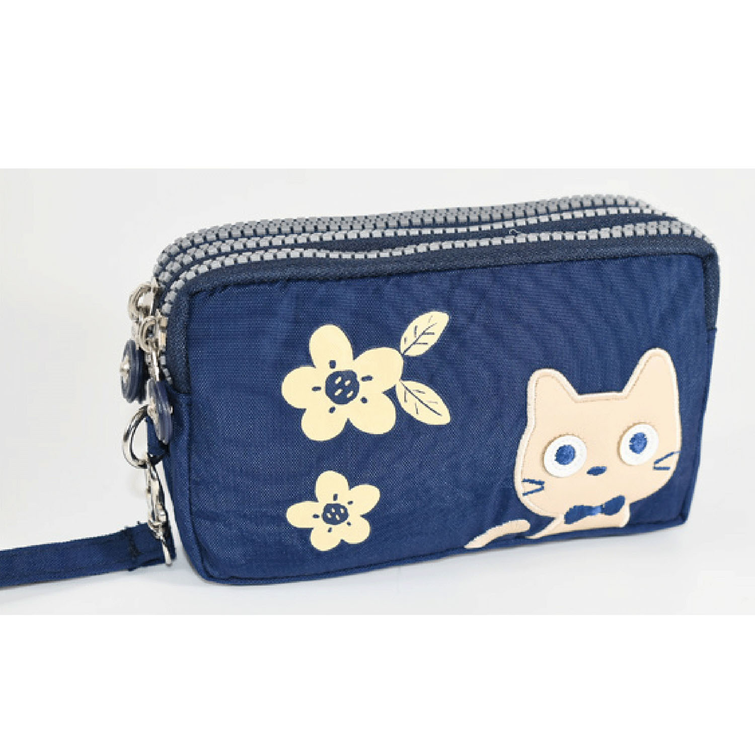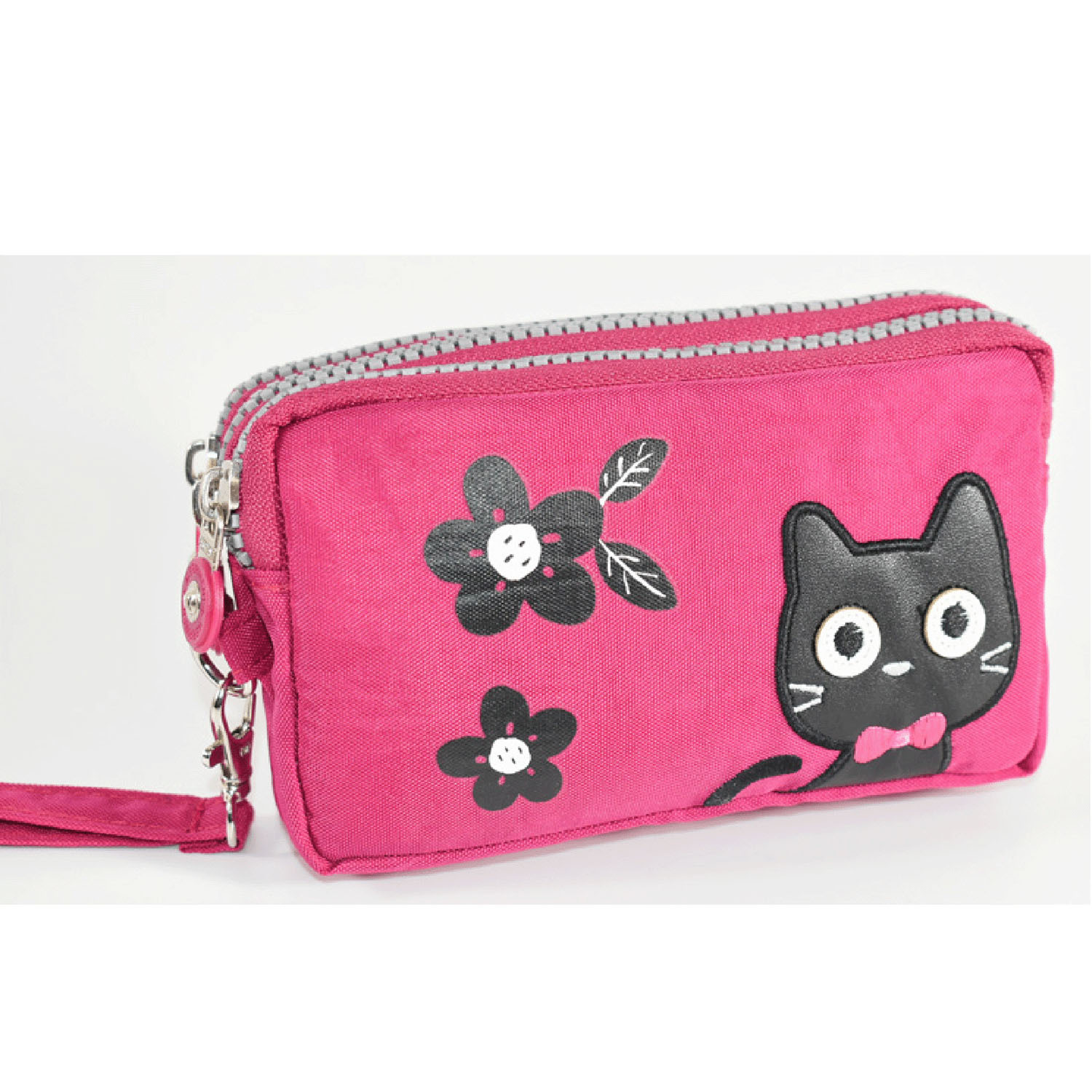 這款小包採用可愛的貓咪圖案,配有三個拉鍊。