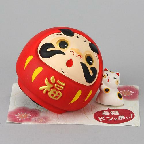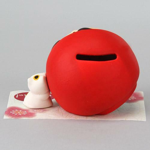 一個可愛的存錢罐,有一隻貓支撐著達摩娃娃。