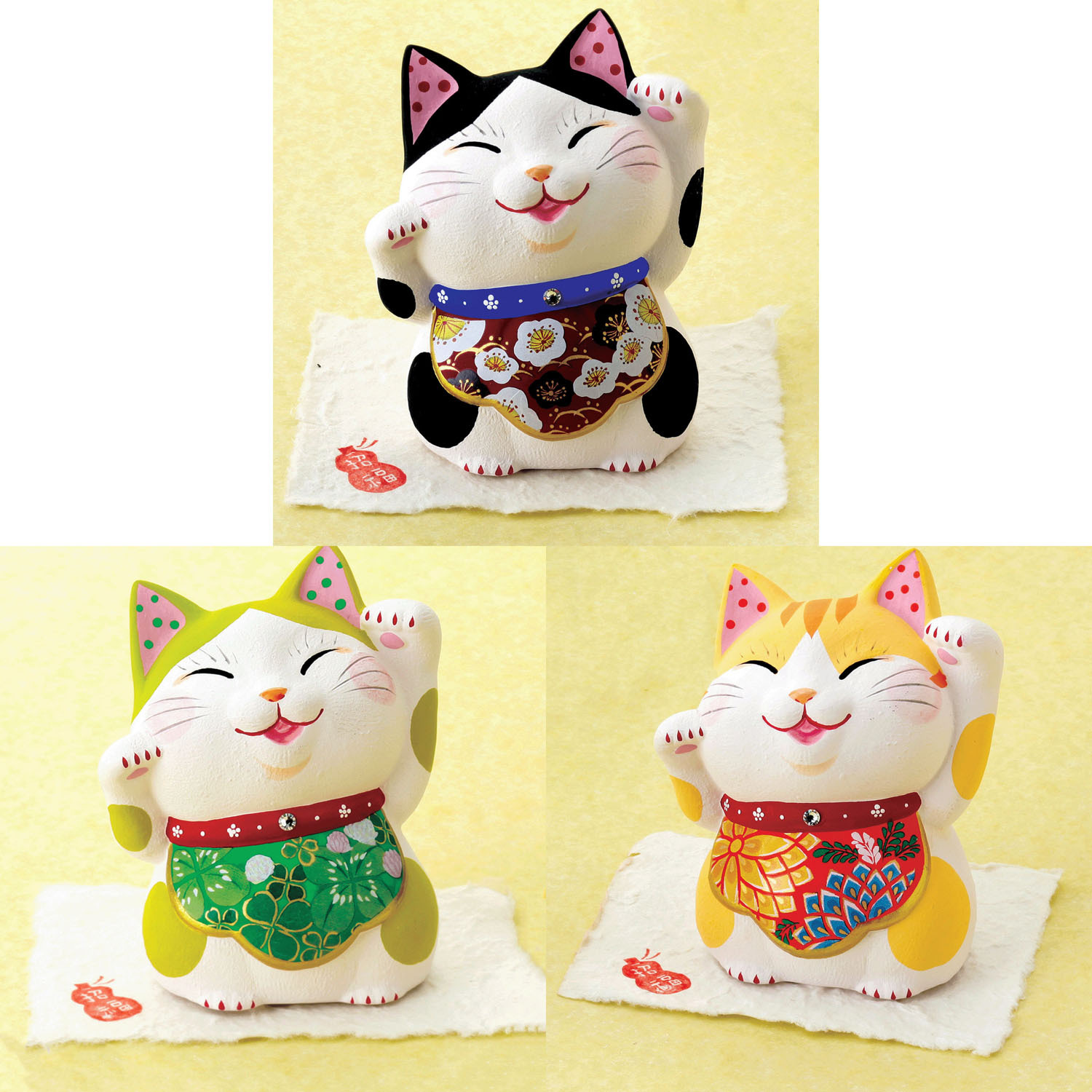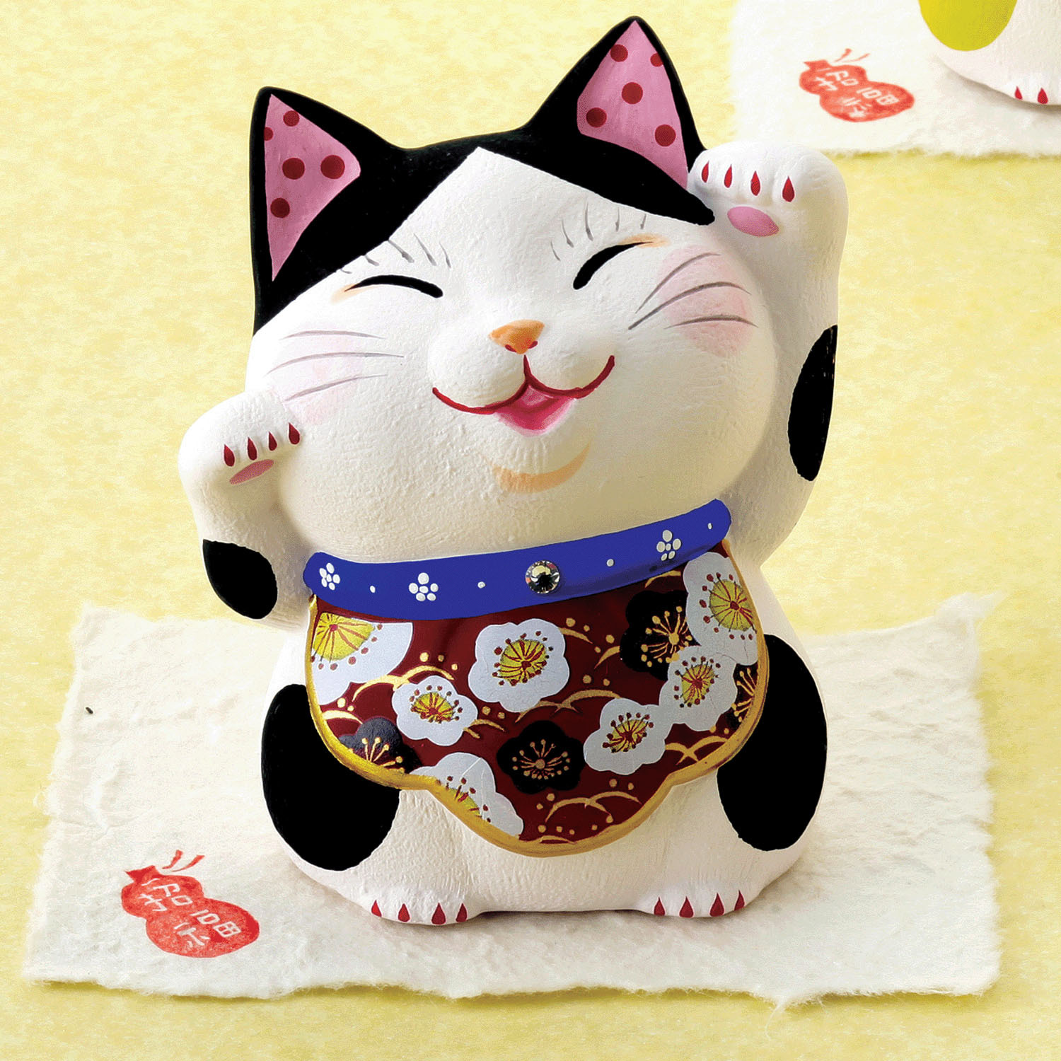 這款招財貓以梅花、菊花和四葉草為主題,設計精美。鮮豔的色彩增添一絲清新氣息。