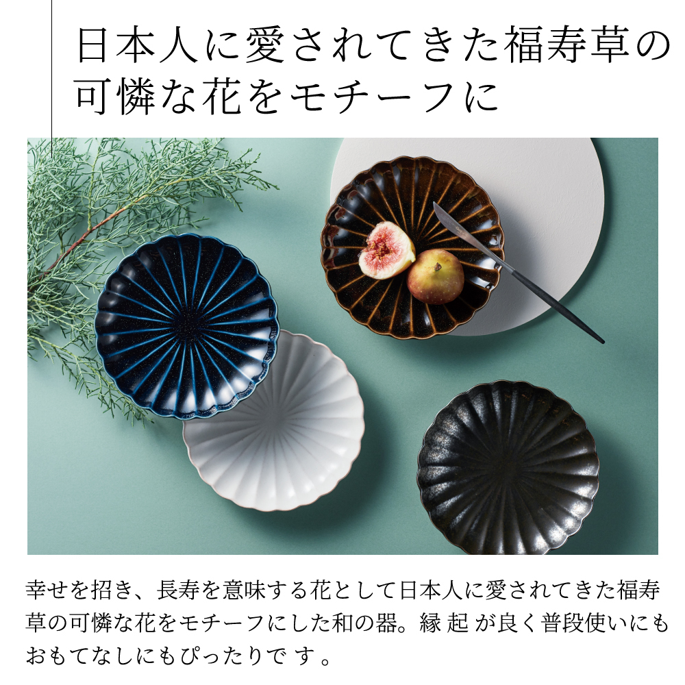 這是一款以被日本人喜愛的象徵幸福和長壽的美麗福壽草為主題的 4 色日式器皿。
