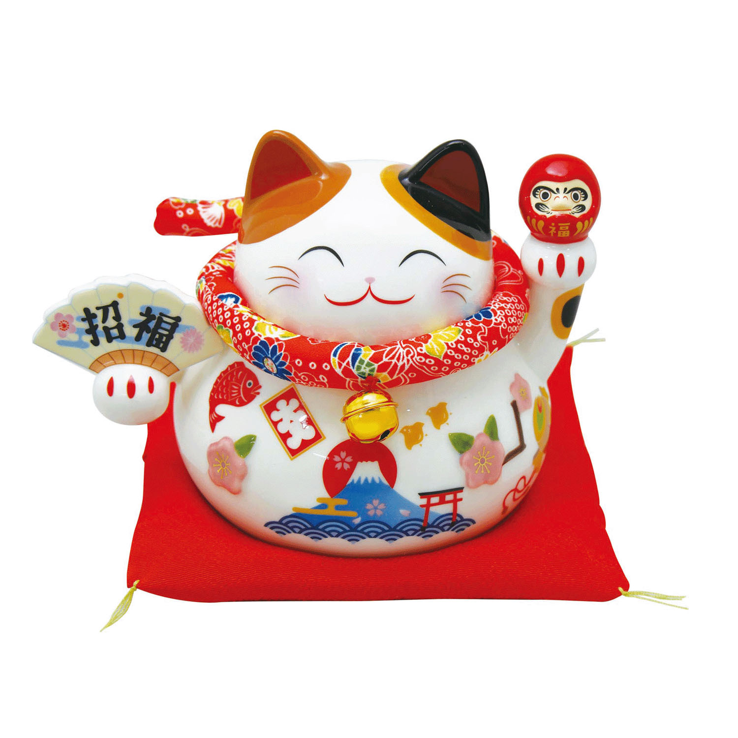 它雙手分別拿著達摩不倒翁和扇子,寓意帶來好運連連。