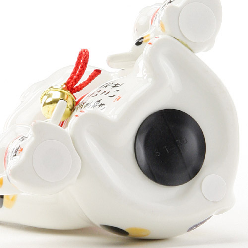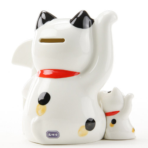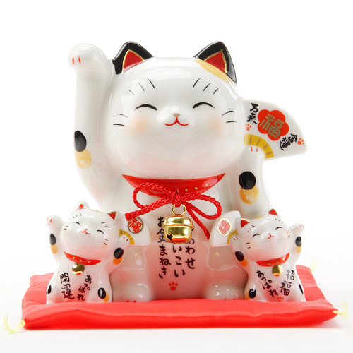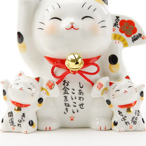 一隻招財貓存錢筒,兩側各有一隻可愛的小貓,象徵你的願望將會實現。
