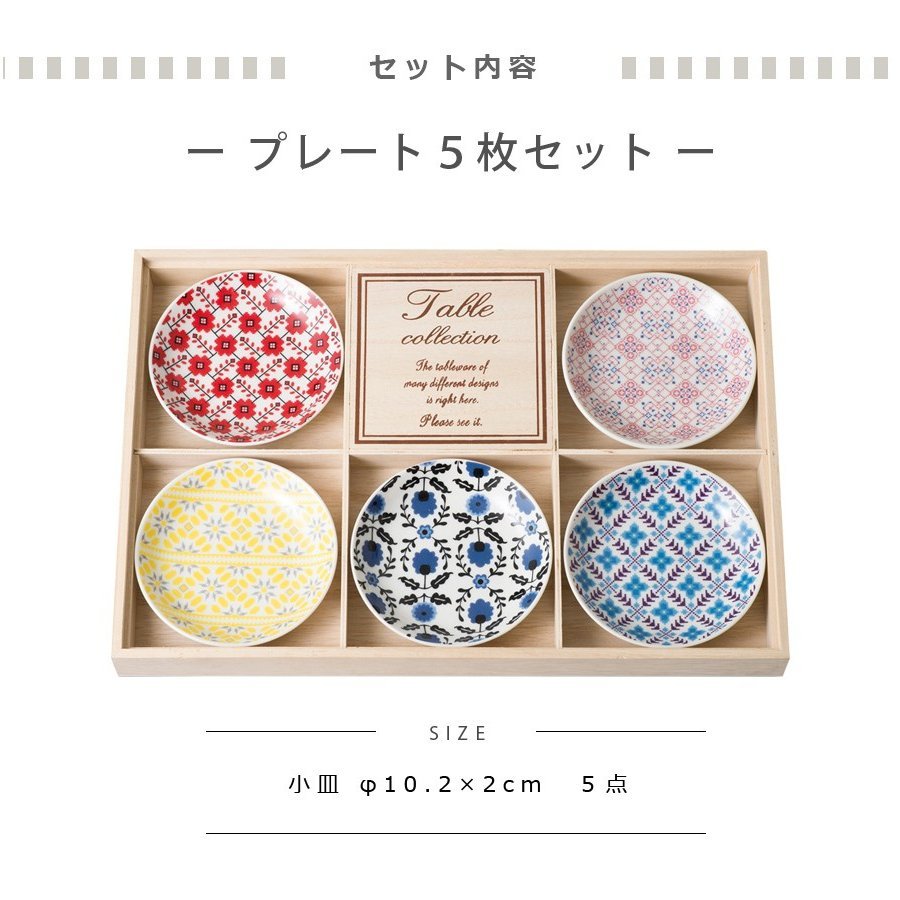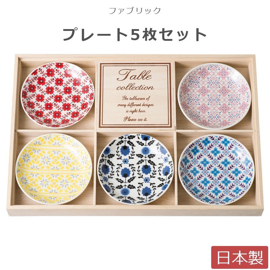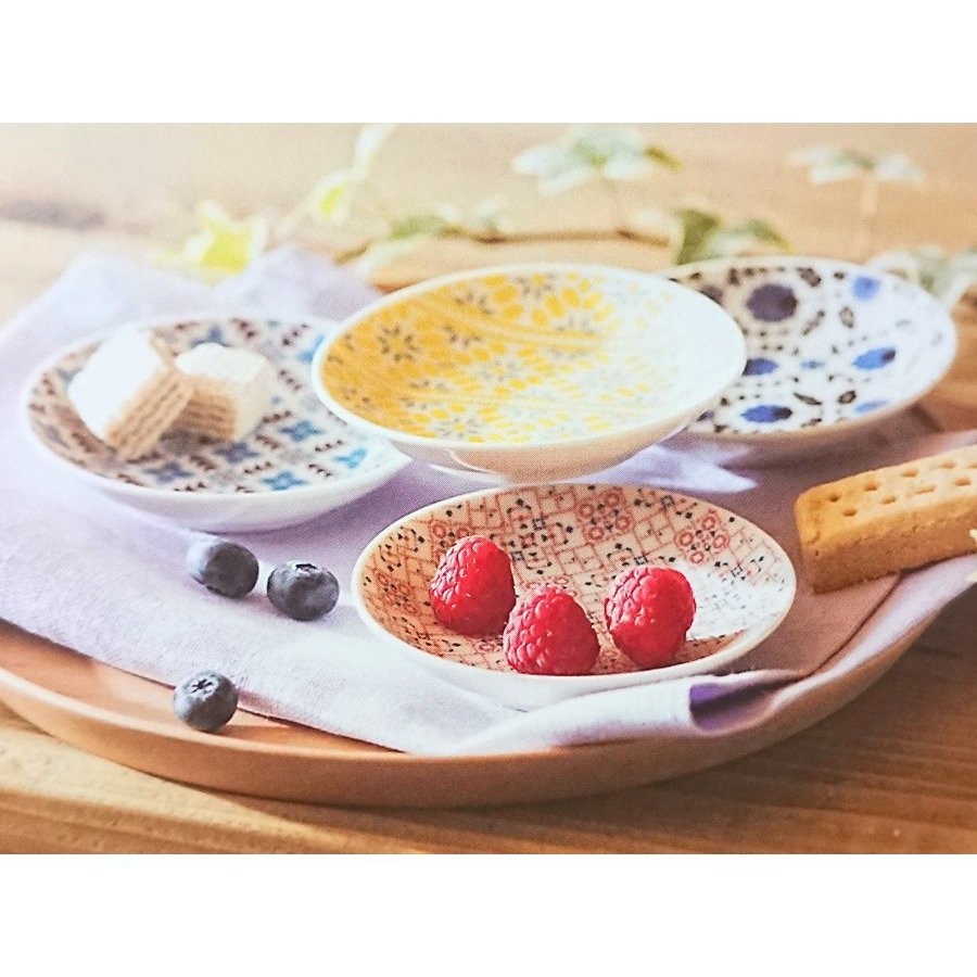 一套 5 個小盤子,帶有紡織品設計。