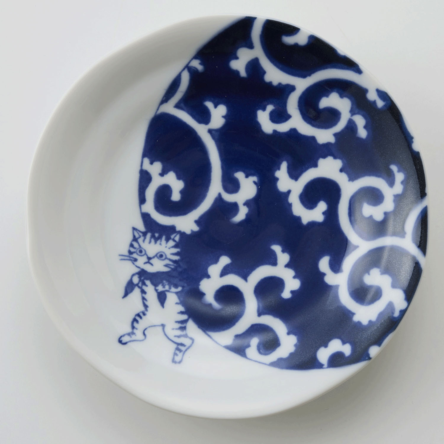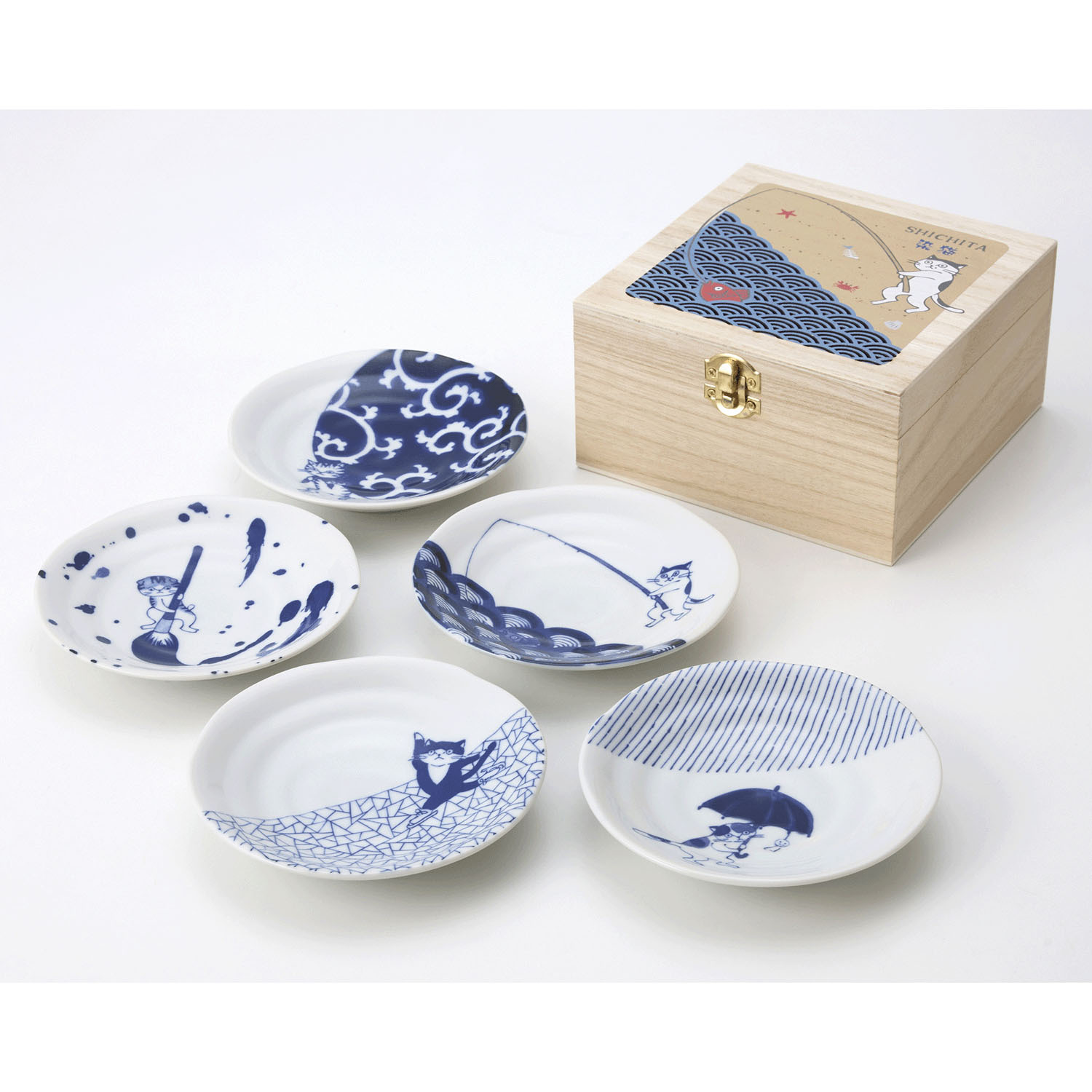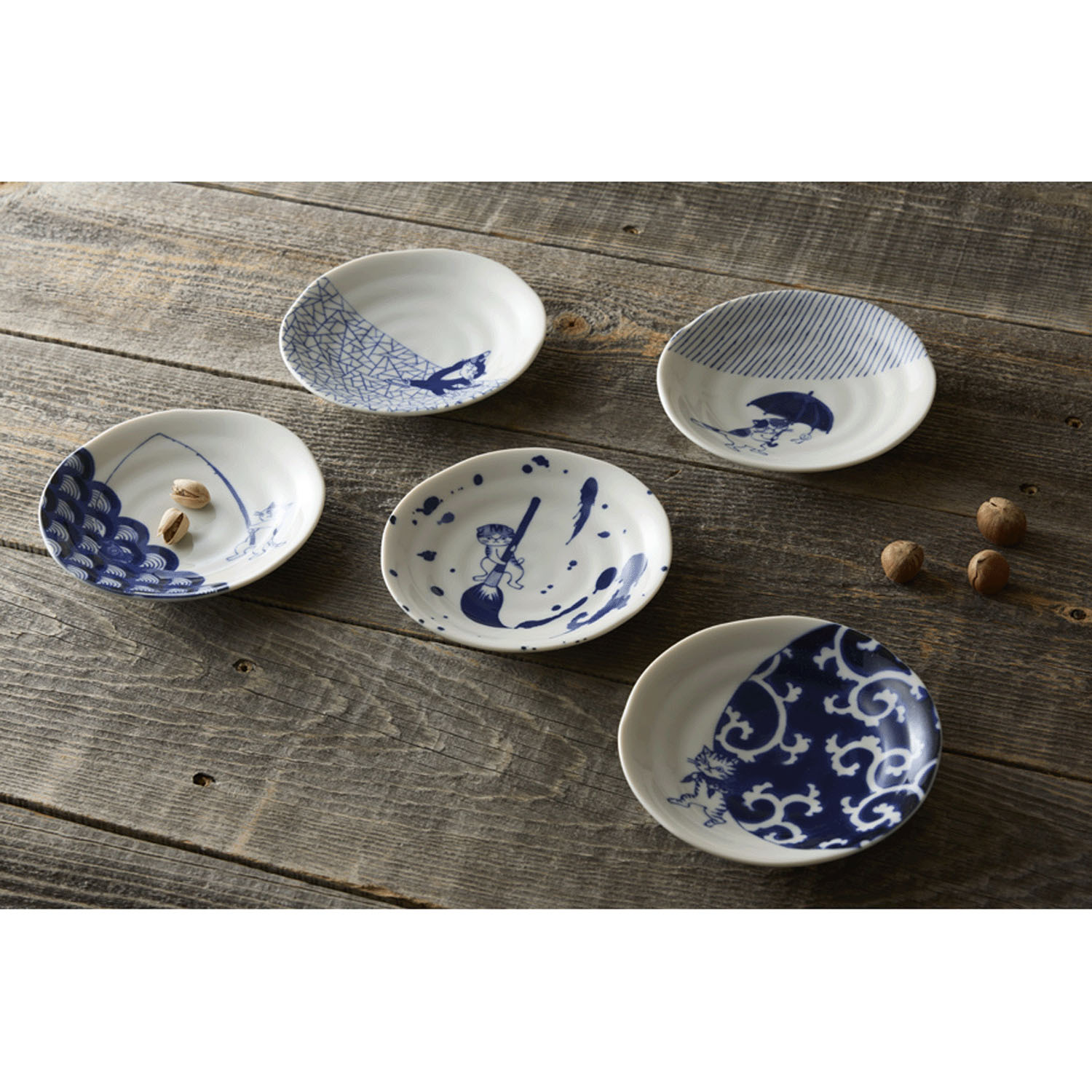 這些小碟以青海波紋、唐草紋等傳統日式圖案為主題,描繪了貓咪嬉戲玩耍的可愛場景。