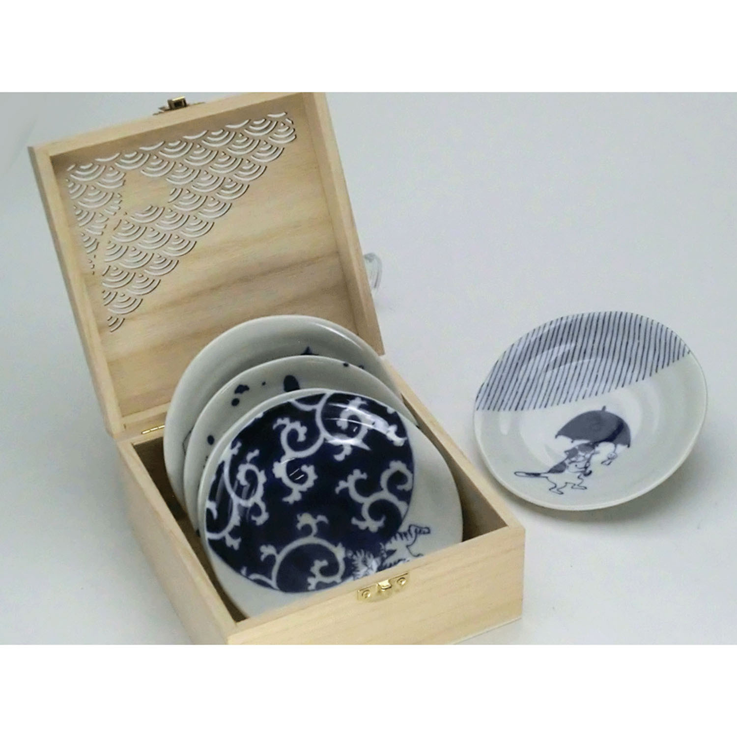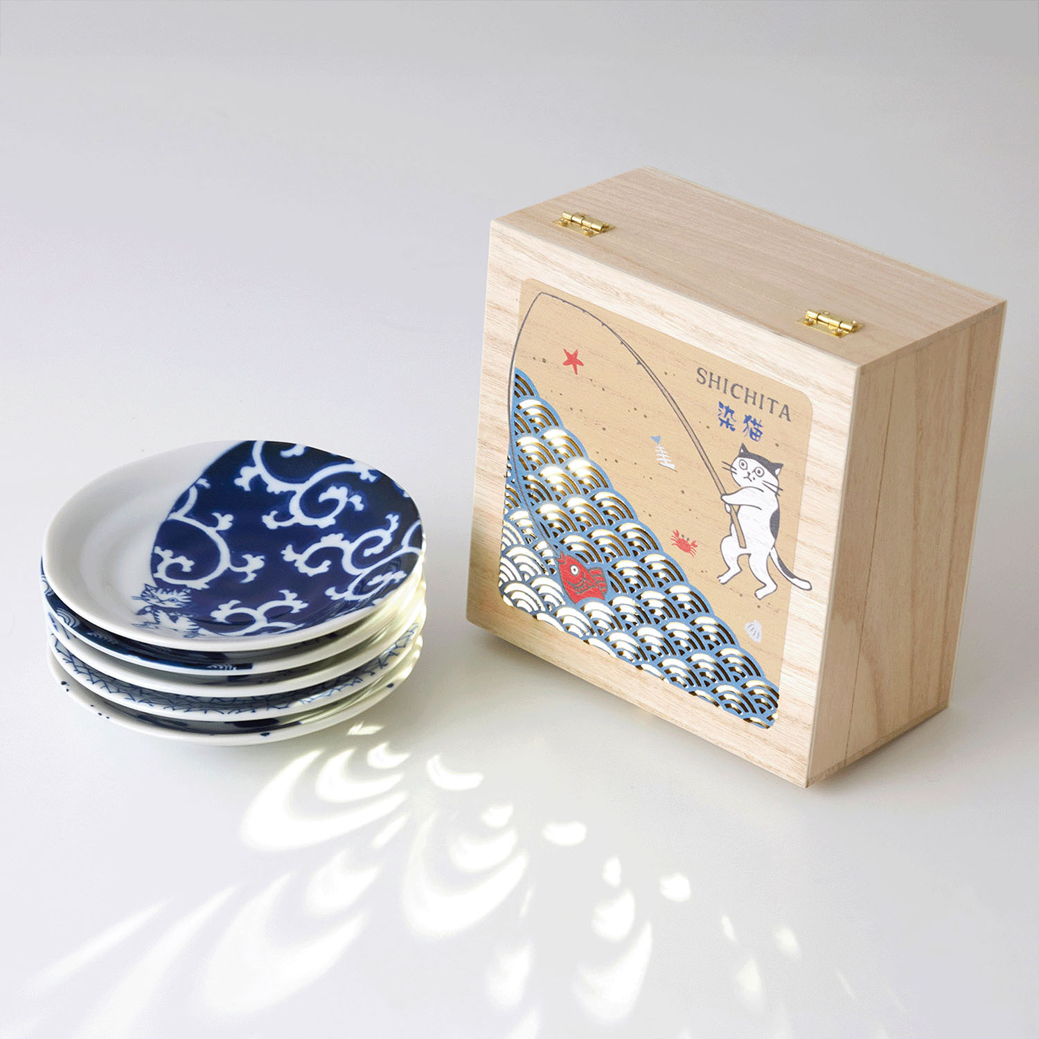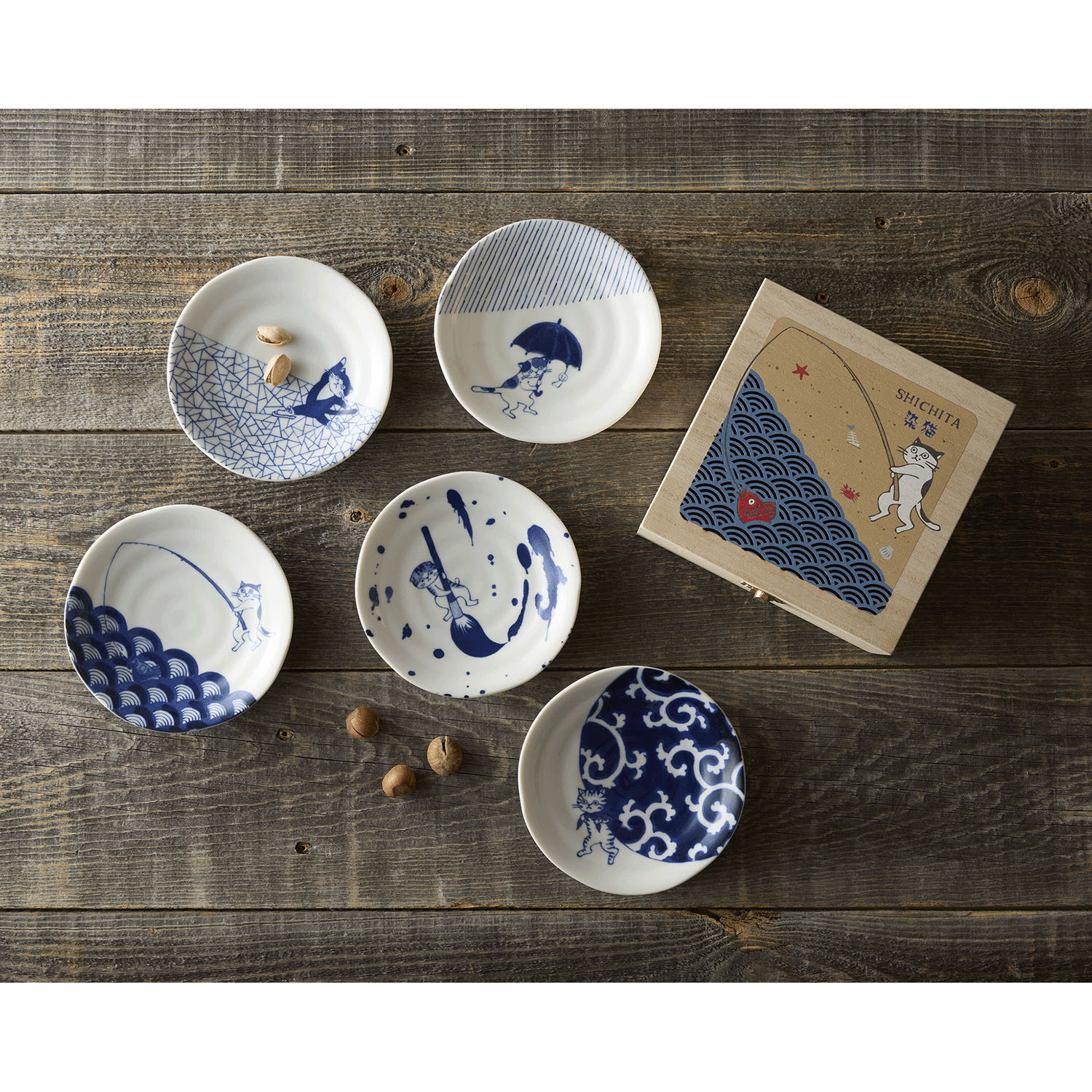 這些小碟以青海波紋、唐草紋等傳統日式圖案為主題,描繪了貓咪嬉戲玩耍的可愛場景。