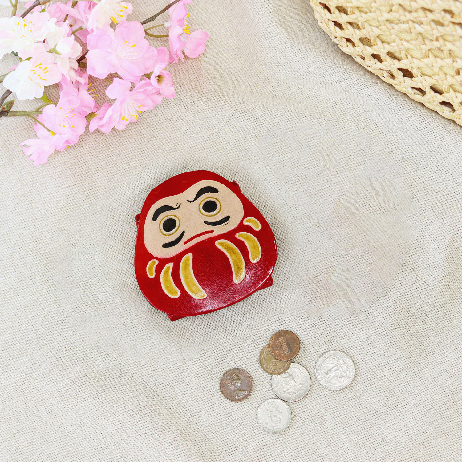 這款羊皮革零錢包採用招福達摩設計,福氣且柔軟。