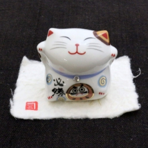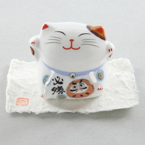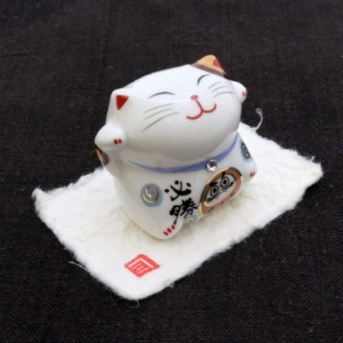 コメント 可愛らしい必勝招き猫。おなかにめでたいダルマのイラスト入り。首輪にはスワロフスキーがキラリ。