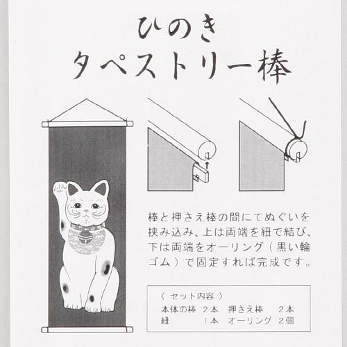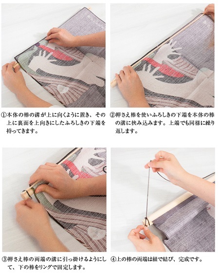 棒と押さえ棒の間に手ぬぐいを挟み込み、上は両端を紐で結び、下は両端をオーリング(黒い輪ゴム)で固定すれば完成です。